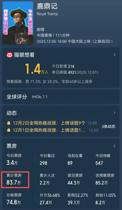 没想到上映5天,票房竟然只有83万,日票房甚至已经跌到了3万。